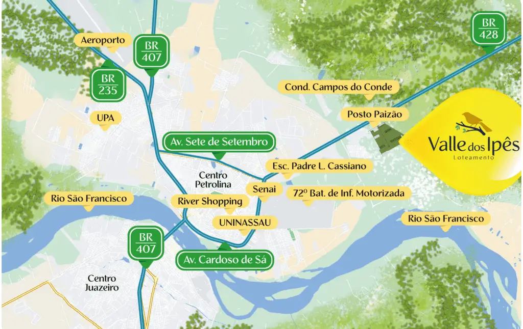 As margens da BR-428, o Loteamento Valle dos Ipês está situado em um vetor de grande crescimento e valorização em Petrolina, próximo a importantes polos comerciais.
